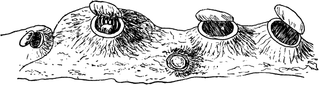 The adult shell, however, retains a certain degree of translucency, which matches very well with the colouring of the tangle-root; and thus presents a great contrast to the shell of the common Limpet, which is found on rocks. The rugged surface of the latter is usually more or less irregularly speckled in harmony with the surfaces on which it lives, though this shell also presents when young occasional touches of blue, which suggests a family likeness in colour tastes on the part of the two kinds of Limpet. The blue in this case, however, is of the dullest and dingiest shade. The Patella pellucida is common on the more rocky portions of our coasts; in spring the young may be seen in thousands on the seaweeds of the Isle of Man; here its habits were first observed and described in detail by the Manx naturalist Forbes, who noticed its peculiar way of finding a hiding place among the roots of the tangle. The same shell-fish, in contrast with the commoner Limpet of the rocks, affords another instance of the way in which [18] shells adapt their forms to their surroundings. In each case the shell is a plain conical cap, and the animal within keeps the shell firmly attached to the base on which it rests. The Limpet can move about at a very creditable snail's pace when it wishes to do so, and at low-water mark, when the tide is beginning to rise, you may easily find them moving about and off their guard; but during many hours of the day, when the tide is out, the main object of the Limpet is to keep its shell as firmly fixed to the rock as possible. It will at once be seen that if the margin of the shell were smooth like that of a tea-cup, and the surface of the rock to which it clung very irregular, many chinks would be left between the margin of the shell and the surface of the rock through which unwelcome visitors might find entrance. The loss of moisture through the crevices, too, would be a serious thing to the animal during the hours when the shell is uncovered by the tide and exposed to the rays of a hot sun. On the other hand, if the margin of the shell were irregular, and the surface on which it rested smooth, unprotected crevices would in the same way be left. So the Limpets adapt the shape of their shell to their surroundings; the Patella pellucida, which lives on the smooth branches of the tangle-root, has a shell with a smooth regular edge; while the Patella vulgata, which lives upon rocks, has a shell with an irregular, indented edge, whose irregularities fit into those of the rock on which it rests. (See Fig. 2.)