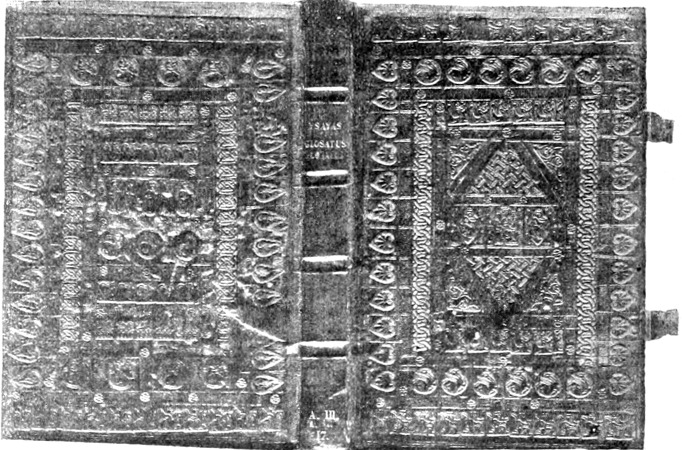 A könyvkötés első nyomaira a rómaiaknál akadunk, akik az egyiptomiak tekercsalakjától eltérve, a könyveket kisebb lapokra írták, amelyeket azután összefűztek. Martialisz egyik epigrammjában már azzal dicsekedett: «Engem mindenki kezében és zsebében hord!» A könyv ebben az új alakjában a «kódex» nevet kapta. Igy természetesen olyasféléről is kellett gondoskodniok, ami a lapokat megóvja. Kezdetben az összefűzött lapokat cédrusfából készített tokokba helyezték, amelyeket szíjas vagy szalagos csatokkal lehetett lezárni. A tokokat gyakran elefántcsonttal, sőt drágakövekkel diszítették. A lapokat metszéssel is ellátták, amely rendesen vörös volt. Azonban a boldogtalan Ovidiusz «Trisztia»-inak metszete fekete volt. «Útra szállsz, kis könyvecském – írja – a város felé és gazdád nem kisérhet utadon. Nem irigyellek. Menj dísztelen ruhában, mint a számkivetett könyvéhez illik! Viseld, boldogtalan, állapotunk öltönyét! Az ibolya színe ne ékesítse tokodat; nem illenék a gyászolónak! Címeden a vörös szín ne vonzza a tekintetet, lapjaidon ne illatozzék a cédrus! Fekete homlokodon ne hordjad a fehér gombokat! Az ilyen dísz csak a szerencsés könyvecskéknek való. Te pedig boldogtalan voltomat nem felejtheted.» A kereszténység első idejében már pergamennel borították be az összefűzött lapokat; még pedig úgy, hogy mindkét tábla elől egymásfelé hajolt. Utána fatáblákat használtak, amelyeket arany- és ezüstdiszítményekkel láttak el. Ezeket a táblákat «diptichon» és «triptichon» elnevezés alatt ismerjük. A IV. században a könyvek kötése körül már oly -15- nagy fényűzést fejtettek ki, hogy szent Jeromos fájdalmasan panaszkodott: «A könyvek drágakövektől csillognak és a meztelen Krisztus meghal a templomok ajtaja előtt.»