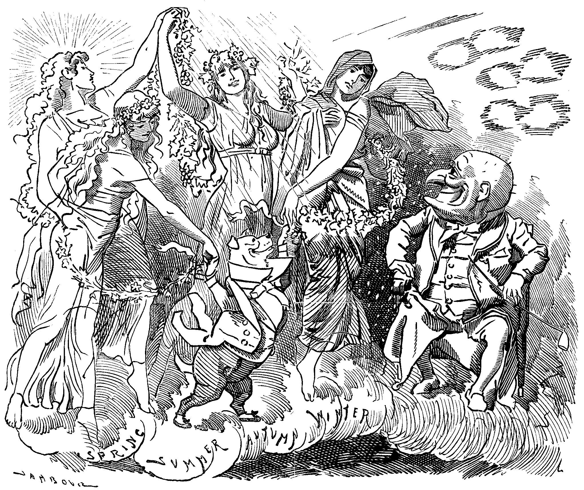 This, Sir, is only a solitary instance of your prescience cited in accidentally turning over the collected pages that seem so familiar and are still so fresh. I could quote indefinitely as I turn over the leaves. But time is shorter than usual this evening. There is less than an hour left of 1877. The procession I spoke of just now has passed out and closed the doors. Under brighter and more inspiriting auspices comes another group. May I present them to my honoured Master? Eighteen Eighty-Eight this is Mr. Punch of whom you may have heard. Mr. Punch, this is Eighteen Eigthy-Eight of whom I expect you will hear a good deal. And here, happier in his possessions than King Lear, are his four daughters—Spring, Summer, Autumn, and Winter. They come to wish you a Happy New Year in which no one joins so heartily as your humble friend and servitor,