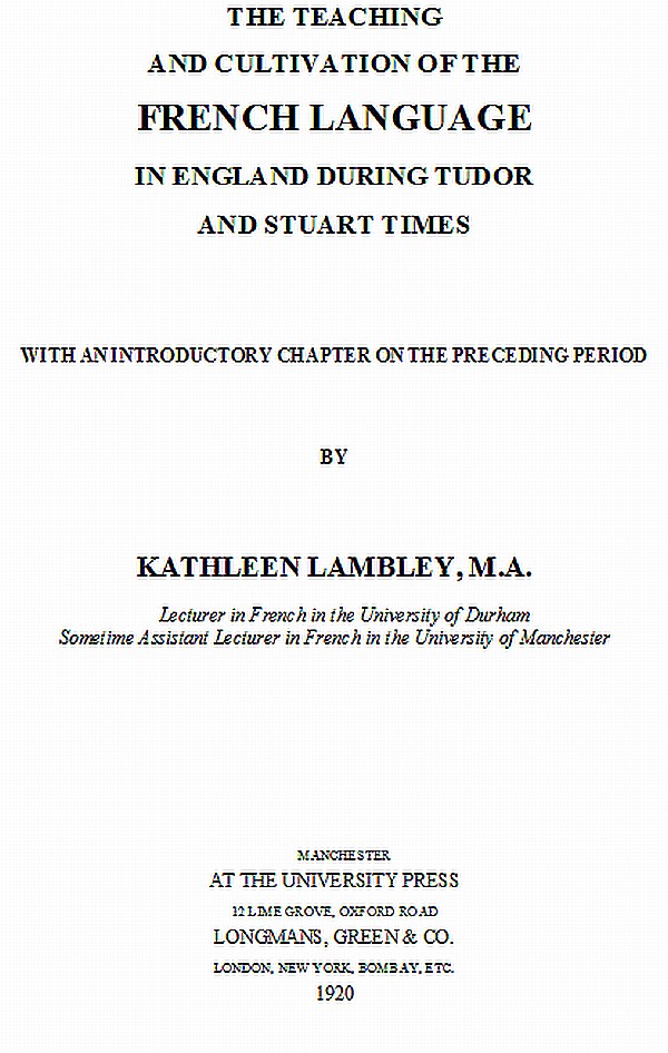 The present work, begun during the author's tenure of a -v- Faulkner Fellowship in the University of Manchester, and completed in subsequent years, is an endeavour to trace the history of the teaching and use of French in England during a given epoch, ending with the Revocation of the Edict of Nantes and the Revolution of 1689, which events mark the beginning of a new period in the study of the French language in this country. No attempt has been made to treat the wider topic of French influence in England in its literary and social aspects (this has already been done by competent hands), though this side of the question is naturally touched upon occasionally by way of reference or illustration.