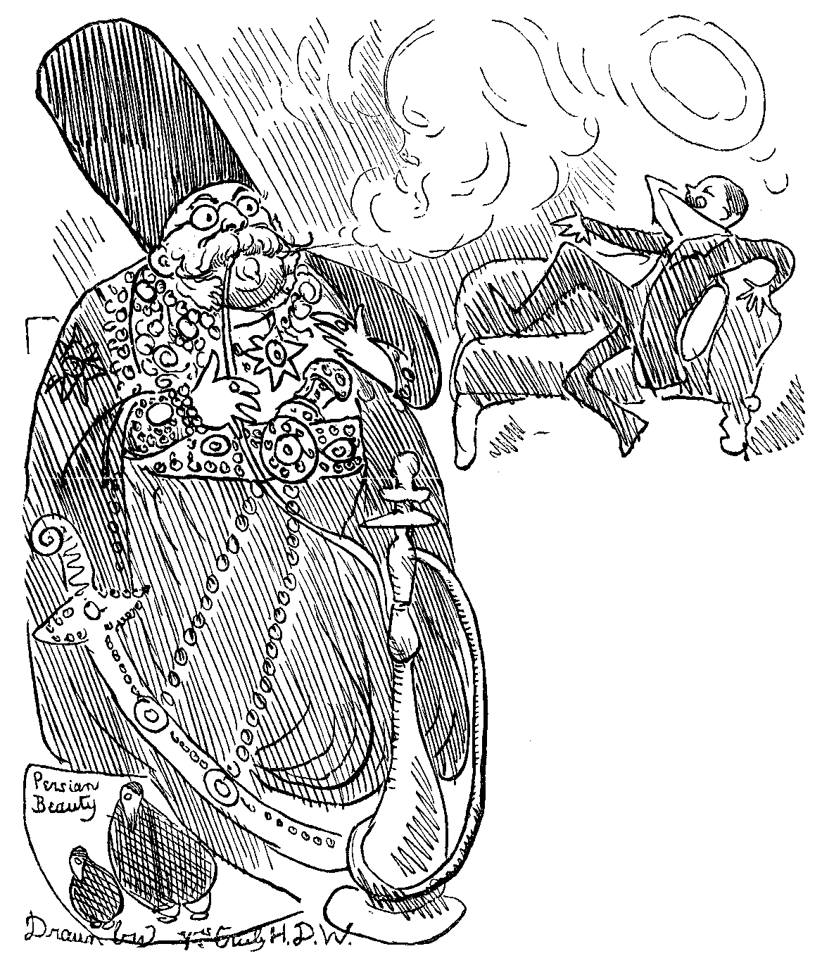 I am, as you will understand, so busy in my preparations for departure, that I fear I may not find time to call upon you, p.p.c., and therefore take up my pen to write these few lines, hoping they will find you well, as they leave me at present. It is an odd reflection to one who has reached my time of life, that henceforward sixteen-shilling trousers shall have no more interest for me. Already, in the privacy of my room, I don the flowing robes of the East, and sit by the hour as you see me in a little sketch I have had made, and beg your acceptance herewith. It is all very strange to me yet. As Gr-nd-lph says, it is the oddest thing in the world that the Ark and I, after much tossing about in troublous waters, should finally settle down in the neighbourhood of Ararat. If I had had my choice, I would not have gone so far afield. The wise men, you know, come from the East, they do not go there; at least, not further than Constantinople, which would have suited me admirably. Rome I have eyed askance. I could have dressed the part for St. Petersburg. Berlin would not have been bad; and I feel that I was born for Paris. But the Markiss of course has his way, and he has mapped mine out for Teheran.
