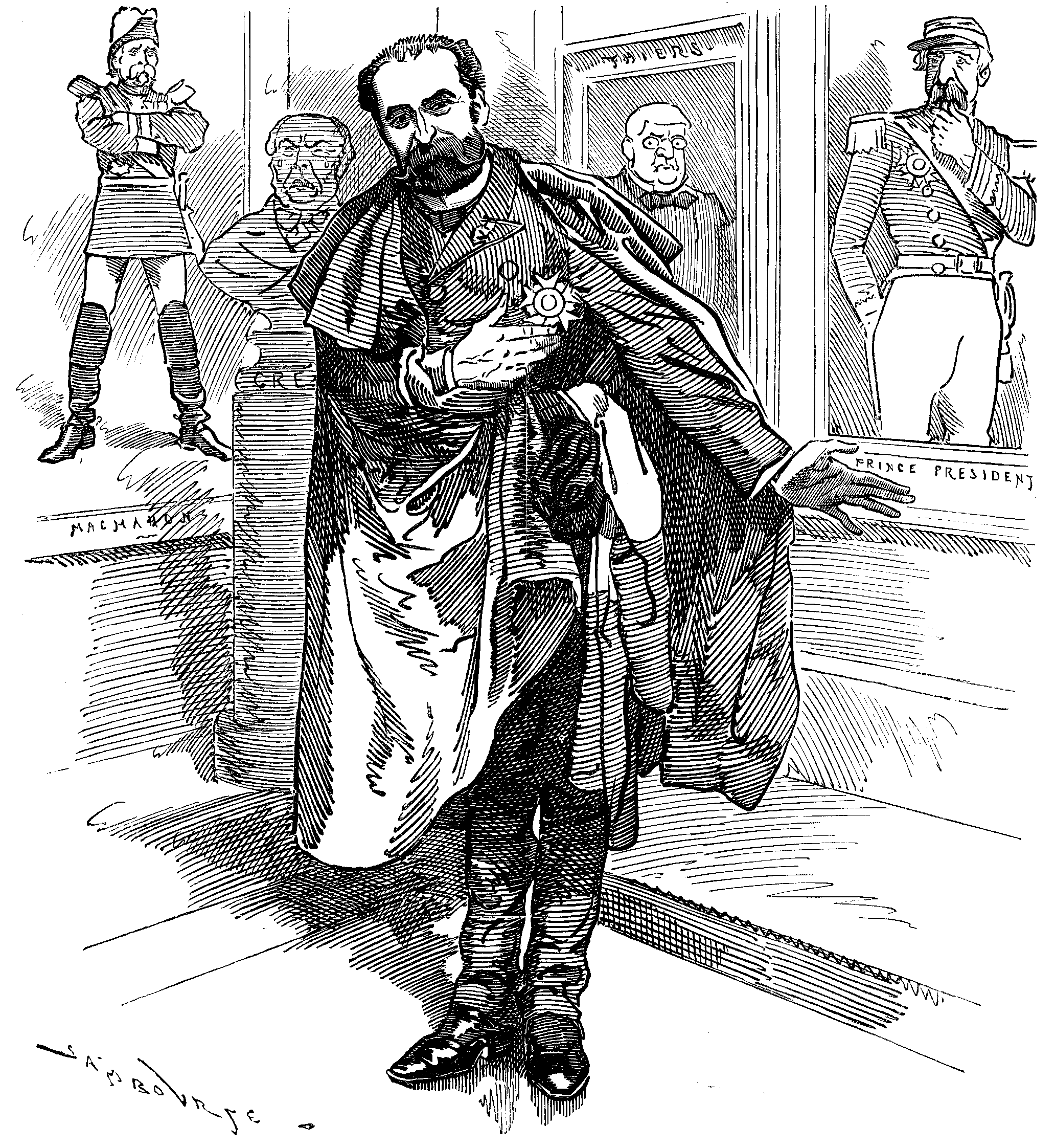 And now behold me solemn, sedate, responsible, the Representative of the greatest of Western Powers at the Court where once Artaxerxes ruled! In quitting Parliamentary life I leave behind me an example which young Members will find it profitable to study. The opportunities I possessed were held in common with hundreds of others whom I leave in obscurity. I had no particular gifts that promised the comfortable pre-eminence I have reached. The coarsest flatterer could not accuse me of oratorical ability. Gr-nd-lph, I confess, excelled me there, and so did G-rst, an abler man than either of us, but lacking in the quality that brought Gr-nd-lphand me to the front and kept us there. What I did, was to keep myself in evidence, and to make myself as disagreeable as possible to people in authority. If the object of attack were Gl-dst-ne, good; if it were N-rthc-te, better, as showing more independence, and as securing the favourable attention of the Opposition. It is a commonplace, ordinary thing to be cheered by your own side. What the young aspirant to Parliamentary distinction should look to, is to gain the applause of the Benches opposite. R-b-ck knew that in old days, and so did H-rsm-n, and in these later times Gr-nd-lph better and more successfully than either.