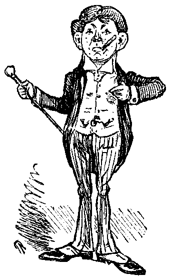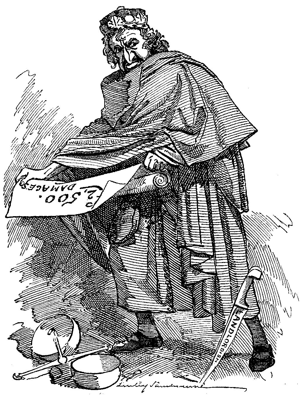 B. B. Well,—it's just as well you didn't say any more. (Goes up to Waiter, confidentially). That man down there was mos' insultin'—mos' insultin'. But, there, I'll give you the penny—there it is. (Presses that coin into Waiter's hand and closes his fingers over it.) Put it in your pocket, quick—say no more 'bout it, Goo' ni'. Only—remember (pausing on threshold à la Charles the First) if anyone wantsh row—(with recollection of Duke's motto)—I'm here! That 'sh all. (To G. B.) I shall say goo' ni' to you outside.