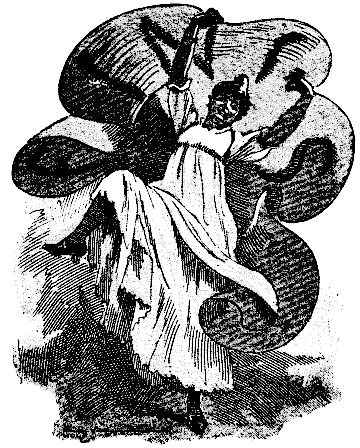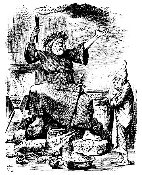 It was his own room. There was no doubt about that. But it had undergone a surprising transformation. The walls and ceiling were so hung with shamrock green and shillelagh branches that it looked a perfect Grove of Blarney. A lurid blaze, like a blue-tongued snapdragon flare, went hissing up the chimney, revealing in weird glimpses on the heated hearth and chimney tiles spectral figures of impish design and menacing gesture. Heaped up on the floor, to form a kind of throne, were Blue Books, abortive Bills, scrolls on which were inscribed endless questions and unnumbered amendments; bundles of party papers and political pamphlets; pallid sucking-pigs that seemed to demand rather opportune interment than human digestion; long wreaths of sausage-like shackles; resurrection pies of indigestible crust and full of offal scraps and tainted "block ornaments"; pudding-shaped bombs; barrels of explosives and fulminants; red hot (political) "chestnuts" of the most hackneyed partisan sort; Dead-Sea apples of the dustiest kind, savouring of sand and strife; fiery looking Ulster oranges; belated (parliamentary) pairs, and seething bowls of raw and vitriolic party spirit, that made the chamber dim, dank, and malodorous with their heady steam. In uneasy state upon this extraordinary conglomerate couch or throne, there sat an ogreish giant of pantomimic size and bogeyishly menacing expression, portentous to see; who bore a smokily-flaring torch, in shape not unlike an Anarch's beacon or Fury's bale-fire, and held it up, high up, to shed its lurid light on Sadstone, as he came peeping round the door.