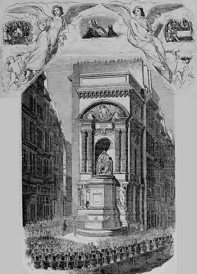 L'inauguration de la statue de Molière a été l'affaire importante de ces jours derniers; le soin de raconter les faits authentiques de cette solennité revient naturellement à l'historiographe ordinaire de la semaine; nous le lui disputons d'autant moins, qu'il connaît Molière mieux que personne, pour avoir publié une excellente édition de ses œuvres, et écrit sa vie avec une affection pleine de sagacité. L'ordre et la marche de cette fête du génie seront donc exposés par lui; il n'oubliera ni M. Samson, ni M. Étienne, ni M. Arago, ni M. de Rambuteau, inclinés au pied de la glorieuse statue, et y déposant, en prose plus ou moins élégante et spirituelle, l'hommage de l'universelle admiration. Pour nous, il ne nous reste qu'à exprimer un regret, qui nous a paru généralement éprouvé: c'est que l'autorité, par une prudence exagérée et sur des craintes sans fondement ait cru devoir tellement isoler cette fête littéraire, que, de populaire qu'elle devait être, elle n'a été réellement qu'une sorte de représentation particulière, jouée au bénéfice du préfet, de l'Académie, et de MM. les comédiens français; quant à la masse des citoyens de toutes sortes, qui s'apprêtait à venir pieusement assister à la cérémonie et saluer, à son tour, le bronze immortel, elle n'a pas été admise; une nombreuse armée de gardes municipaux, fermant toutes les issues, a maintenu un vide complet dans toute la longueur de la rue de Richelieu, depuis l'angle de la rue des Petits-Champs jusqu'à la place du Carrousel; ainsi, les entrées du peuple ont été généralement suspendues.