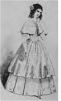 La coiffure, nous le répétons, est dans tout son éclat; elle est tantôt riche, tantôt simple; quelquefois c'est une torsade de velours avec des pompons de chaque côté de la tête, à côté d'une coiffure algérienne aux broderies et franges d'or; ou bien encore de longues barbes gothiques attachées par un peigne dont chaque camée peut faire l'admiration d'un antiquaire; puis un petit bord en velours noir posé sur la tête et retenu par quatre épingles en magnifiques pierreries, pu encore un bonnet espagnol en dentelle noire avec des roses. Ces variétés donnent beaucoup d'éclat à un cercle.