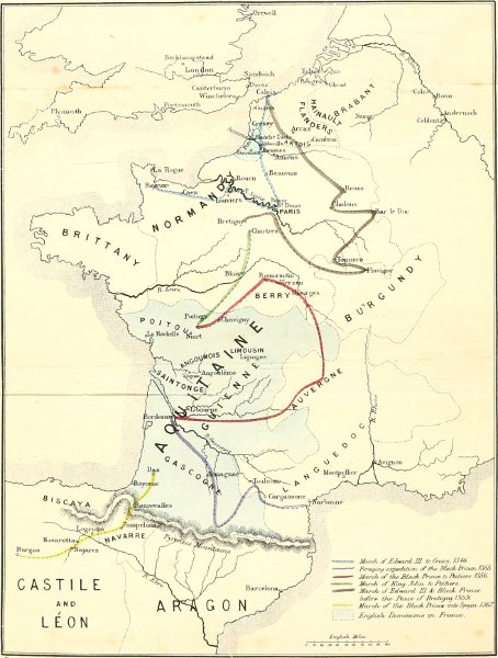 In reality his great victories were fruitless, and the wonderful success of the first half of Edward III.'s reign brought no lasting result. Edward III. was no more of a politician than his son. Instead of being content with what he had won, and making it secure, he indulged in wild schemes of ambition; and whilst dreaming about the French crown, he lost the Duchy of Aquitaine. It seems impossible to doubt that if Edward III. and his son had set about it in the right way, they might have secured for themselves the possession of Aquitaine. As it was, they not only lost what they had gained, but with it also what had come down to them from their fathers. Yet we need not deplore this. For the progress of England it was far better that she should not be hampered[Pg 220] with external possessions. The most important thing was, that England herself should grow strong before she thought of extending her dominions. Edward III.'s wars were useful to the progress of England, not because of the glory which they shed round his name, but because the great outlay which they involved drove him to call frequent Parliaments that he might raise supplies.