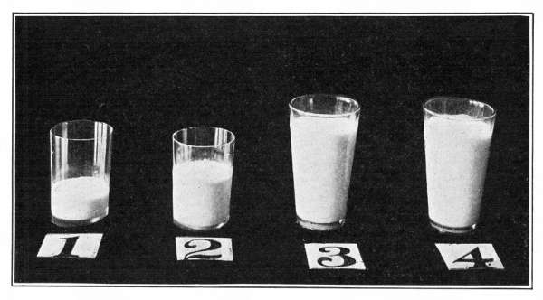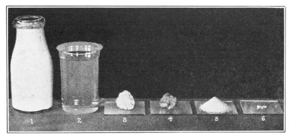 You may then surmise from the sweet taste of milk that sugar is present; the chemist knows how to obtain it in pure form as “sugar of milk.” The chemist also finds certain mineral substances which remain behind when all the water is evaporated and the curds and sugar burned away. These mineral substances are spoken of by the chemist as “ash,” because this is what remains after burning the other portions of a food material, as ashes remain from a wood fire. Figure 1 shows you these substances in the amounts in which each occurs in a pint of milk. The sugar is one of a class of substances to which the chemist gives the name carbohydrate. To the substance in the curd that is different from all the other substances in the milk the name “protein” is given.