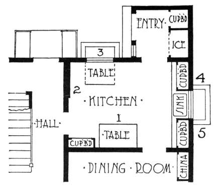 Figure 3 shows a larger kitchen, with a serving room between it and the dining-room. The ice box is in the outer17 wall and is filled from the outside. The cupboard at (1) could hold the cooking utensils, as it stands conveniently between the sink and the range. A kitchen as large as this should have a small table on rollers for carrying food materials and utensils back and forth. If you have ever visited the kitchen in a dining-car you will realize that compactness is one of the advantages of the small kitchen over the large, although the latter may be better ventilated and cooler.