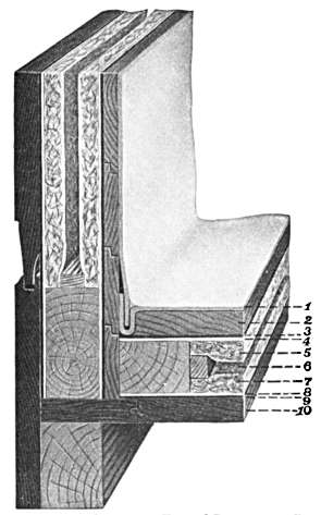 The best floor is one covered with an inlaid linoleum, which gives warmth and comfort to the foot, is easy to clean, and wears for many years (Fig. 4). It should be cemented down at the edges that no dust may collect. The first cost is rather high, but it pays in the end. A hardwood floor of maple or yellow pine is also satisfactory. Tiling is the cleanest of all floorings, but is very fatiguing to the worker.