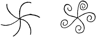 | Swastikas with four arms crossing at other than right angles, the ends ogee and to the left | 848 |