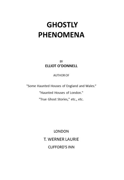 Without any attempt at an exhaustive classification (which is, of course, impossible), I have divided the different kinds of phantasms that have come within my experience as follows:—Phantasms of the Dead, Phantasms of the Living, and Elementals, and since I have defined each of these species in another of my works, it will be sufficient for me to say here, that by Phantasms of the Dead, I mean the phantasms of every form of life that has inhabited a material body, whether human, animal, or vegetable, for I maintain that there is a spirit in everything that lives; that by Phantasms of the Living, I mean the superphysical counterpart of a living material body that can, under certain conditions not at present fully known, leave that body and manifest itself at any distance away from that body, either visually or auditorially; and that by Elementals, I mean all spirits that have never inhabited any material body.