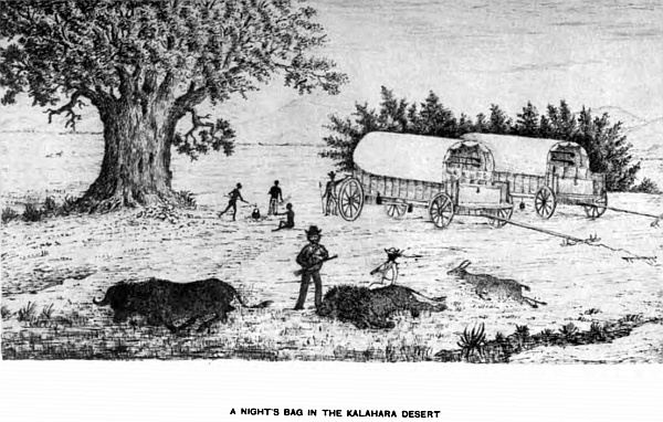 A slight description of my travelling-house may give greater insight into African travelling. My waggon measured seventeen feet in length and five feet in width. In front is a waggon-box for holding such things as are required for immediate use, and also for the driver and another to sit on. Six feet of the front I reserve for my own special use; boxes arranged on the bed-plant, full of grocery and other things, upon which, a thick mattress and bed-clothes. On one side boxes are arranged to form tables for writing or drawing. Around the sides of the tent are side-pockets for holding all kinds of useful articles—powder-flasks, shot, caps, brushes, books, tools, and other things required at a moment’s notice. On each side of the waggon my rifles, shot-guns, and revolvers are conveniently slung, that in a moment either of them can be in the hand, three on each side. The back part of the waggon is kept for bags of flour, meal, bread, water-casks, and everything needed for the road. My driver and boys sleep under the waggon or in the tent, as they may think fit. Such is my travelling-house. Therefore, when on the trek, I am independent, asking no favours of any one, and far from civilisation I am at home and want for nothing, a grand thing for one who is going to explore unknown regions, on the dark continent of Africa, where the white man’s foot has never trod. What a field is before me!