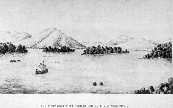 My oxen well rested, and horse fat and saucy, I had nothing to wish for but health and fair weather. The first part of my journey was back to Ladysmith, then on to Newcastle, crossing the Biggarsberg range of hills, going over the same ground I had recently travelled, and I arrived there on the 28th. My object was to make for the upper source of the Vaal river and commence my work at that point, but I found so much opposition with the Boers against my taking drawings on this second trip, that I changed my plans and settled to proceed to the westward and commence my surveys beyond their boundary, and finish the upper portion of the Vaal at some future time. Therefore I retraced my steps back from the upper Vaal by the road. I took the former route to Harrysmith; from thence treked across the Free State, a most desolate and uninteresting country, and reached the Vaal river, which I crossed below Potchefstroom, where I began my work, arriving on its banks on the 25th of July 1864. I have therefore omitted any reference to the country through the Orange Free State because I have nothing to relate, except that a more bleak, cheerless region could not be found; always excepting Walwich Bay, Angra Pequina, and the back of them. Every day’s trek like the other, shooting game, inspanning and outspanning; most monotonous to one wanting to arrive at the unknown region.