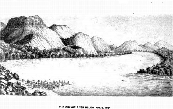 I outspanned at a sharp bend of the Vaal, on the fifth day from the Koranna station, where there is a stony drift crossing the river to the missionary station at Pniel, where Bloom and his people lived. In 1869, extensive diamond-diggings were worked here, and many thousand people were employed at Pniel and Klip Drift; both were very extensive camps, the latter being the headquarters of the Provisional Government, previous to the annexation of Griqualand West, when it received the name of Barkly, and continued to be the headquarters up to 1875, when all the departments were transferred to Kimberley.