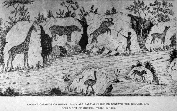 The old forts on the Umvuli, with the old gold-diggings, along the base of the Leputa and Lobolo mountains on the Mlebka river, Kambesa, Nuntigesa, Mandou, Zimbo, Piza and many others in the Mashona country on the east; and to the west of the Sabia river, near each, are extensive old diggings, and on the Ingwezi river there are very perfect ruins, but completely enclosed in bush; the walls are extensive and thick, all of them built of hewn granite, and laid in regular courses; another on the Nuanettie river, to the west of the Woohu mountain, is a very good specimen of these ancient forts, situated on a rocky eminence, well defended on all sides, and also covered in by trees and bush. The Zimbo, or Zimbase, ruins of an old fort are situated on a small branch of the Sabia river, in 20 degrees 16 minutes South latitude. A short distance from its banks there are several low walls on an open space, but the most extensive is that situated on a low granite hill; the walls are about eight feet thick and five feet in height in the lower portion, the upper part measures twenty feet, and forms a sort of round tower very similar to the ruins on the Tati, which have been described; the walls are built of hewn granite stone, and in regular layers; on the inside there are several beams inserted in the walls projecting eight feet, composed of a hard and fine-grained stone of a dark colour. Upon one of them are carvings, diamond-shaped, one within another, separated by wavy lines; they are much overgrown by shrubs and creepers, and seem to be of the same date, and erected by the same people as those already described. Several old gold-diggings are in the vicinity. Altogether these ancient forts, that are so largely distributed over these regions, are most interesting, and when this country is more developed and better understood, they may lead to discoveries that may throw more light upon the subject. That the Portuguese did deal largely with the natives in gold is clearly established, and if all these ruined forts were their work, they must have occupied the country in very considerable numbers, which seems hardly likely, because there is no record of their having done so to the extent which these ruins show.