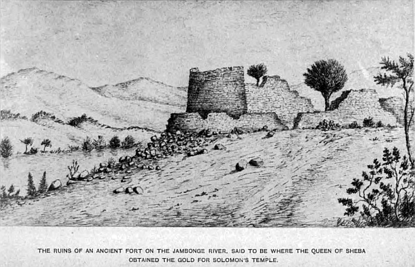 But what seems very remarkable, no instruments or anything has been found to lead to the time when this part of the Mashona country was overrun by this supposed white race, but a time may come when prospecting may be allowed, that will throw more light upon this subject. These old diggings may have been worked by the Queen of Sheba’s people, and subsequently by a white race. It is very clear, there must have been a different race from the present, that worked the ground for gold in these parts, several hundred years ago; from the ruins now standing, I think proves they may have been the same under the name of Abbalomba.