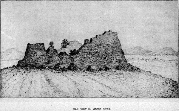 The only relics I have found are broken pieces of pottery, containing much mica, and the well-worn stones the natives used to crush their corn, which must have been in use many years, as they are hollowed out almost like basins, and the round stone the size of a cricket-ball, much worn on one side in pounding the grain. One ancient grave I opened, but found nothing but a spear-head of iron, that crumbled to pieces when handled; the bones had disappeared. I may mention, when prospecting in the channels worn in the beds of the rivers by the water, I have found a great many copper beads mixed up in the gravel and sand, and a piece of silver, that looks like part of a bar, about half an inch square and an inch in length, that was also lying in the bed of the river close to the ruins of the old fort on the Ingwazi river.