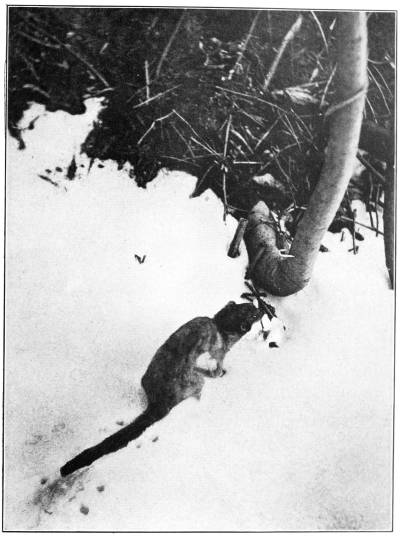 Before attacking the hickory, however, I began to cut down the brush surrounding the doomed tree, so as to gain clear space for the axe-swing. Almost immediately a vindictive spice-bush in falling knocked off my glasses, and they fell into the snow somewhere ahead of me. Without them I am in the same condition as a mole or a shrew, my sense of sight being only rudimentary. Down I plumped on my knees in the snow and fumbled in the half light with numbed fingers through the cold whiteness ahead.