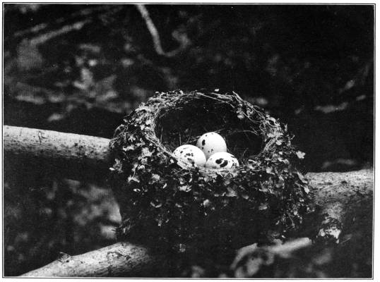 The last nest of all was my treasure nest of the summer. I was about to give up the game and start off for a walk, when suddenly, right ahead of me, hanging on the limb of a sugar-maple, not five feet above the stone wall, I saw the swinging basket-nest of a vireo, with the woven white strips of birch-bark on the outside which all vireos use in that part of the[Pg 13] country. It was as if a veil had suddenly dropped from my eyes, for I had been looking in that direction constantly, without seeing the nest directly in front of me. Probably, at last, I must have slightly turned my head and finally caught the light in a different direction. I supposed that the nest was that of the red-eyed vireo, the only one of the five vireos which would be likely to build in such a location. Climbing upon the wall to look at it, I saw that the mother bird was on the nest. Even when I took hold of the limb, she did not fly. Then I slowly pulled the limb down, and still the brave little bird stayed on her nest, although several times she started to her feet and, ruffling her feathers, made as if to fly. As the nest came nearer and nearer, I could see that she was quivering all over with fear, and that her heart was beating so rapidly as to shake her tiny body. Finally, as she came almost within reach of my outstretched hand, she gave me one long look and then suddenly cuddled down over her dearly loved eggs and hid her head inside of the nest. Reaching my hand out very carefully, I stroked her quivering little back. She raised her head and gave me another long look, as if to make sure whether I meant her any harm. Evidently I seemed friendly, for as I stroked her head she turned and gave my finger a little peck, then snuggled her head up against it in the most confiding, engaging way. As she did so, I noticed that a white line ran from the beak to the eye, and that she had a white eye-ring and a bluish-gray head. As I looked at her, suddenly from[Pg 14] a nearby branch the father bird sang, and I recognized the song of the solitary or blue-headed vireo, who belongs in the deep woods and whose rare nest is usually found in their depths. As the male came nearer, I could see his pure white throat which, with the white line from eye to bill and the greenish-yellow markings on either flank, make good field-marks. The four eggs, which I saw afterwards when the mother bird was off the nest, were white with reddish markings all over instead of being blotched at one end as are those of the red-eyed vireo. Every day for the rest of that week I visited my little friend; and before I left she grew to know me so well that she would not even ruffle up her feathers when I pulled the limb down.