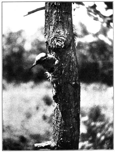 It was under quite different circumstances that I last heard the best winter singer of all. Never was there a more discouraging day for a collector of bird-songs. The year was dying of rheumy age. On the trees still hung a few dank, blotched leaves, while the sodden ground plashed under foot and a leaden mist of rain covered everything. Yet at the edge of the very first field that I started to cross, a strange call cut through the fog, and I glimpsed a large black-and-white bird crossing the meadow with the dipping up-and-down flight of a woodpecker. It was the hairy woodpecker, the big brother of the more common downy, and a bird that usually loves the depths of the woods. Hardly had it alighted on a wild-cherry tree, when an English sparrow flew up from a nearby ash-dump and attacked the new comer. The harassed woodpecker flew to the next tree and the next, but was driven on and away each time by the sparrow, until finally, with another rattling call, it flew back to the woods from whence it had come. A moment later a starling alighted on the same tree, unmolested by its compatriot.