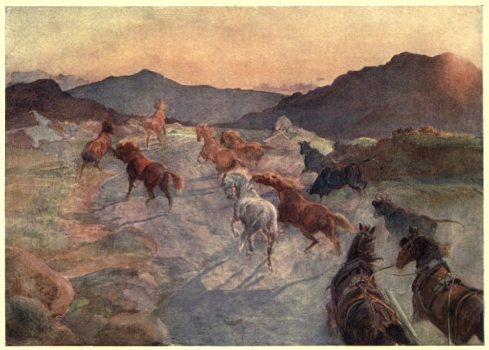“The scenery grew more rugged still, and against ranges of distant mountains jutted out the strong grey and brown rocks, the stone cairns and cabins of the Wild West land.
