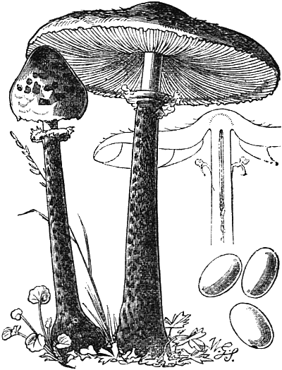 “Our best and standard mushrooms are the pink-gill (A. campestris); snowball (A. arvensis); peach-kernel (A. amygdalinus); nut (A. procerus); French (A. prunulus); morel (M. esculenta); coral (Clavaria); and omelette (Lycoperdon giganteum). These are almost universally in high esteem. Yet tastes differ on these things as on fruits and vegetables; some putting one, some another, at the head of the list, though fond of all and ever ready to use any of them—as one who prefers a peach may yet relish an apple. There are some among us who regard A. procerus as fully equal to [159] A. campestris, and I am almost of the same opinion. When broiled or fried it truly makes a luscious morsel. I mention in this connexion, that this species here bears the name of nut mushroom, from a quality that I do not find mentioned in the books which describe it. The stem when fresh and young has a sweet nutty flavour, very similar to that of the hazel nut. Is this the case with you? Its flavour is so agreeable that I am fond of chewing the fresh stems. From this peculiarity in connexion with its movable ring, its form and colours, I deem it a perfectly safe species to recommend for collecting. We have no species likely to be mistaken for it, except A. rachodes, and I fully tested the innocence of this before commending the first to others. This has been suspected by some, but I have found it harmless. Though pretty well flavoured, it is not comparable with A. procerus, and the flesh is so thin and spongy that no one would choose it when those of more compact texture are to be had. A. excoriatus, of the same group, is a much preferable species.