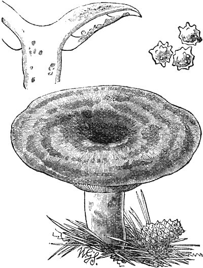 Pileus smooth, fleshy, umbilicate, of a dull rufous orange, turning pallid from exposure to light and air, but zoned with concentric circles of a brighter hue; margin smooth, at first involute, and then becoming expanded; from three to five inches across. Flesh firm full of orange-red milk, which turns green on exposure to the air, as does any part of the plant when bruised.[130] Gills decurrent, narrow, each dividing into two, three several times from the stem to the edge of the pileus; of a dull yellow by reflected light, but being translucent, the red milk shines brightly through them. Stem from one to three inches high, slightly bent and tapering downwards; solid, becoming more or less hollow with age; short hairs at the base; sometimes pitted (scrobiculate).