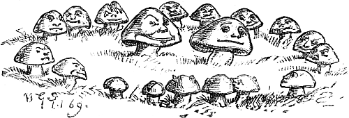“On the whole, it would appear that the advice of an eminent physician, an ardent admirer of the fungus, was good and sound. When he heard of the escape my family had on this occasion, he said that this article of diet should be partaken of with ‘great caution.’ And by the way, is not this itself a very suspicious expression? ‘Great caution!’ If I am introduced to a gentleman, and told at the same time that I must conduct myself towards him with ‘great caution’ or he will probably do me some deadly mischief, it would hardly be thought a very hearty and promising introduction; yet here we are told that this excellent family to which we are so warmly introduced has some members belonging to it so villanously disposed, that possibly we may pay for our acquaintance with our lives. This is not very encouraging, and so the course adopted by a young lady who indulges in these experiments, to whom I was speaking the other day, would seem to be a very prudent one. She says she never partakes of these dainties till she has[166] seen the effect they have had upon somebody else! But even so, only picture the ghastly scene which a banquet of this kind would present; each guest looking anxiously into his neighbour’s face, awaiting in terror the contortions which are to show that he has partaken of the fatal dish.”