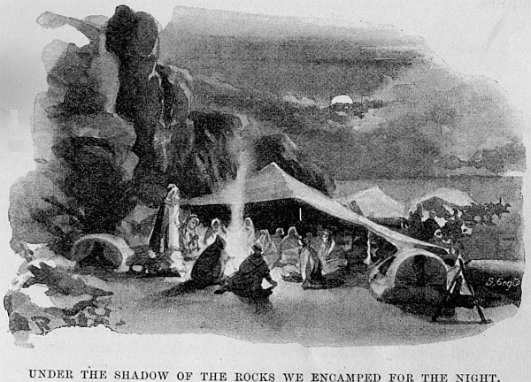 Then in the falling gloom we again moved on. Slowly our camels plodded, the rhythmic movement of their heads causing their bells to jingle, and now and then an Arab would chant a weird Bedouin song, or goad on his animals, administering heavy blows emphasised by sundry forcible imprecations with frequent references to Eblis.