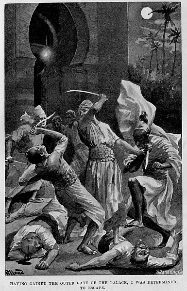 Leaving him, I rushed out to assist my companions, for the rattle of musketry was incessant, and bullets were singing about us in a manner that was particularly disconcerting. Dashing forward, I saw our Spahis had apparently been taken completely by surprise, four of them having fallen dead, and two were lying near, writhing under the agony of their wounds.