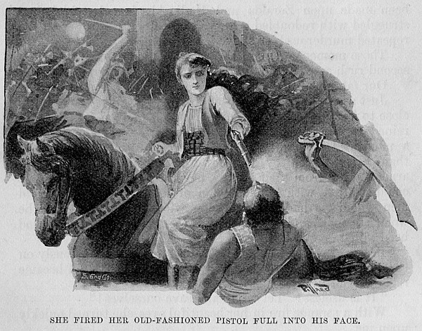 In a second we had closed in deadly embrace. Clutching me by the throat, he forced me backwards, at the same moment uttering a curse and raising the keen blade above his head. For a second it was poised in mid air, but quick as thought I managed to wrench away my right hand, and, bringing it across my breast, fired my revolver full into his dark, sinister face.