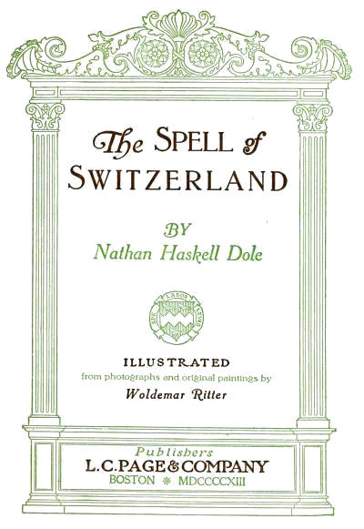The spell of Switzerland can be best expressed not in the limited observations of a single person but rather by a concensus of descriptions. The casual traveller plans, perhaps,[Pg vi] to ascend the Matterhorn or Mount Pilatus; but day after day may prove unpropitious; clouds and storms are the enemy of vision. One must therefore take the word of those more fortunate. Poets and other keen-eyed observers help to intensify the spell. These few words will explain the author’s plan. It is purposely desultory; it is not meant for a guide-book; it is not intended to be taken as a perfectly balanced treatise covering the history in part or in whole of the twenty-four cantons; it has biographical episodes but they are merely hints at the richness of possibilities, and if Gibbon and Tissot and Rousseau stand forth prominently, it is not because Voltaire, Juste Olivier, Hebel, Töpfer, Amiel, Frau Spyri, and a dozen others are not just as worthy of selection. One might write a quarto volume on the charms of the Lake of Constance or the Lake of Zürich or the Lake of Lucerne. Scores of castles teem with historic and romantic associations. It is all a matter of selection, a matter of taste. It is not for the author to claim that he has succeeded in conveying his ideas, but whatever effect his work may produce on the reader, he, himself, may, without boasting, claim that he is completely under the spell of Switzerland.
