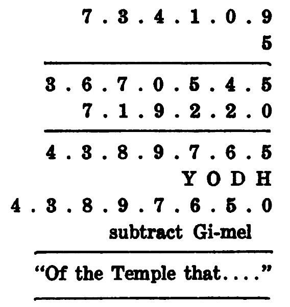 Then will the words of the prophet be fulfilled the secret place of concealment in the Mount of Offence be opened, and, after nearly two thousand five hundred years, to its just ownership, that of the Hebrew race, will be given back the most sacred relics of that colossal and wonderful hoard, the Treasure of Israel.