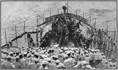 Getting away from Hampton Roads may have sent a lump into many a man's throat, but not one showed it. On every ship the band was playing the usual good-by medley composed of "Home, Sweet Home," "The Girl I Left Behind Me" and "Auld Lang Syne." The middle part of the medley brought thumping of many feet on the deck, but there was silence and stern looks ahead when the beginning and end were reached, over and over again.