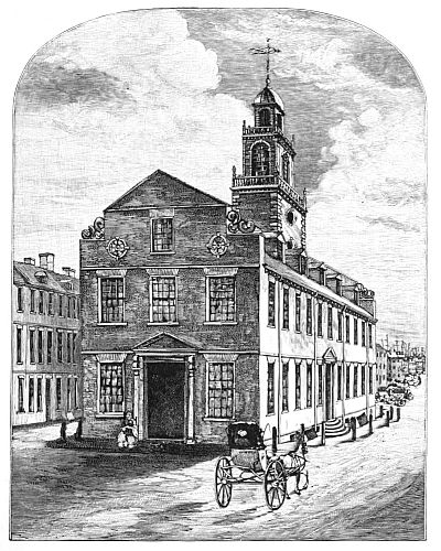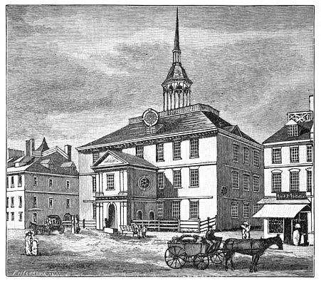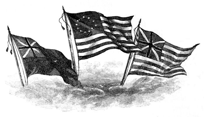 [15] Things seemed to be getting into somewhat the condition contemplated in the satirical print of “The Man in the Moon,” which appeared as frontispiece to a tract published in London in 1776, entitled “A Plea of the Colonies on the Charges brought against them by Lord Mansfield and others.” The Man in the Moon is George III. looking through a telescope held by his Tory chief justice, whose sleeve shows the Scotch plaid of Clan Murray. He looks upon a reversed and topsy-turvy world, in which New York (whose true latitude is nearly the same as that of Naples) appears farther north than London, and America is east of Europe. The American coast is covered with vast armies, and the whole British fleet is on its way thither, leaving England exposed to the attack of a French host gathered at Dunkirk. Meanwhile the Gallic cock crows lustily, and the sketchy outline of Great Britain indicates that the artist supposes the island “may be so far wasted before the year 1800, that people will hardly know where the nation resided that was once so formidable.” See Tracts 985, Harvard University Library.