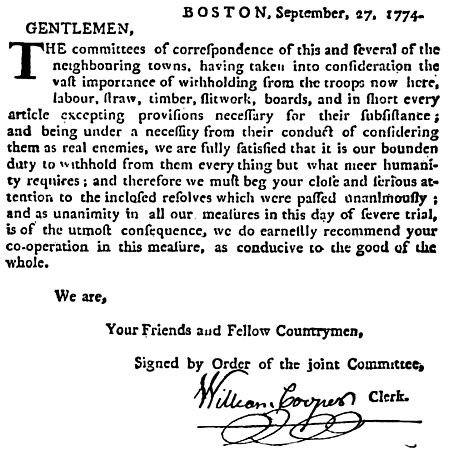The committees of correspondence of this and several of the neighbouring towns, having taken into consideration the vast importance of withholding from the troops now here, labour, straw, timber, slitwork, boards, and in short every article excepting provisions necessary for their subsistance; and being under a necessity from their conduct of considering them as real enemies, we are fully satisfied that it is our bounden duty to withhold from them everything but what meer humanity requires; and therefore we must beg your close and serious attention to the inclosed resolves which were passed unanimously; and as unanimity in all our measures in this day of severe trial, is of the utmost consequence, we do earnestly recommend your co-operation in this measure, as conducive to the good of the whole.