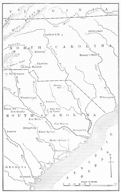 [41] It is interesting to contrast with the movements of Cornwallis those of an eminent general in more recent times. Early in 1865 General Sherman was at Columbia, on the Congaree river, about thirty miles southwest from Camden, and the difficult task before him was, without any secure base of operations nearer than Savannah, to push the Confederate forces northward to a decisive defeat in North Carolina. With this end in view, Sherman feigned to be aiming at Charlotte, while in reality he moved the bulk of his army northeasterly across the Pedee and Cape Fear rivers to Goldsborough, near the coast, where he established a new and secure base of operations. The battle of Bentonville, fought just before Sherman reached this base, was the unsuccessful attempt of his skilful antagonist, Joseph Johnston, to prevent his reaching it. Sherman’s march northwestward from his new base was well secured, and Johnston’s surrender near Hillsborough was a natural sequel. But—as my friend, Mr. John Codman Ropes, in a letter to me once pointed out—"had Sherman pursued his march from Columbia to Charlotte, and thence until he had met and fought Johnston, the result of the inevitable losses of the battle, leaving the question of victory aside, might have been such as to compel a retreat to Savannah.”