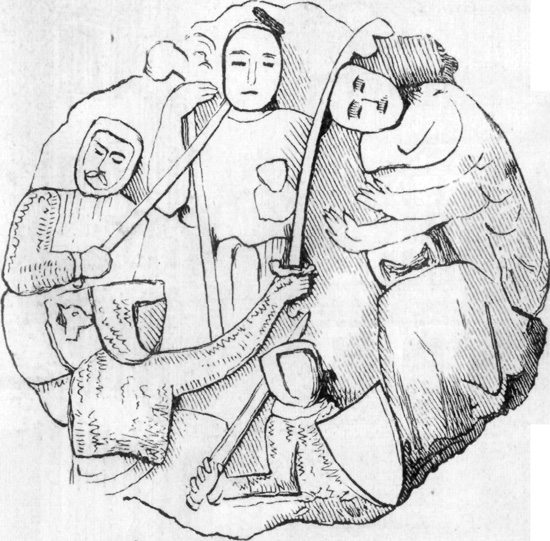 The Mohammedan conquest of course swept away the ornaments of the interior—the ambo, the iconostasis and the holy table. The heads of the crosses were chiselled off, so as to destroy the cruciform shape, and the numerous groups and figures portrayed in mosaic were covered with coats of whitewash. During the restoration of the church in the reign of Abd-ul-Medjid these works of art were once more brought to light by Fossati, and sketches of them made by this architect and by Herr Salzenberg before they were again hidden from sight. The figures of the four seraphim were never covered, and still look down upon the desecrated temple: on the four piers hang huge shields bearing in Arabic characters the names of Aboo-bekr, Omar, Osman and Ali, the four companions of the Prophet, whom the orthodox Soonees reverence as the true khalifs. The floor is covered with rich carpeting. As the Mussulman at prayer turns to the Kebla at Mecca—that is, to the south-east—and as the church was built nearly east and west, the pulpit, the carpet, the long lines of worshippers are now arrayed obliquely to the length of the building.