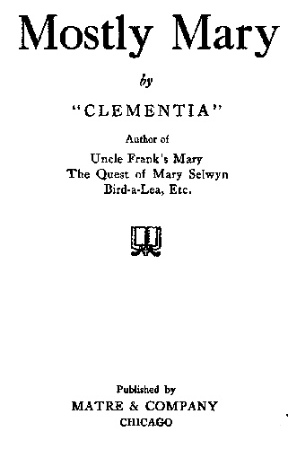 Uncle Frank's Mary is Clementia's first book, and it is full of thoughtful interest; has a wonderful plot development, charming dialogue, and an abundance of action. It introduces a host of delightful personages besides the lovable little heroine.
