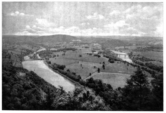 The railroads cross the height of land between the sources of the Lehigh and the affluents of the Susquehanna, through the Sugar Notch, at about eighteen hundred feet elevation. When the train moves out to the western verge of Nescopec Mountain there suddenly bursts upon the gladdened sight the finest scenic view in Pennsylvania—over the fair Vale of Wyoming, with all its gorgeous beauties of towns and villages, forests and farms, under the bright sunlight, and having laid across it the distant silver streak of the glinting Susquehanna River, all spread out in a magnificent picture seen from an elevation of twelve hundred feet above the river level. For nearly twenty miles the Susquehanna can be traced through the long, trough-like valley, from where it breaks in through the Lackawannock Gap in the North Mountain, under Campbell's Ledge, far to the northward, away down south to where it passes out the narrow gorge at Nanticoke Gap. The long ridges of the Nescopec and Moosic Mountains enclose the valley on one side, and over on the other are the great North Mountain or Shawnee range, and the higher ridge of the main Allegheny range behind. In the distant northeast the view is prolonged up the 237 Lackawanna Valley. In this splendid Wyoming Vale, spread out like a map, is a landscape of rich agriculture, dotted over with towns and villages, coal-breakers and huge culm-piles, the long snake-like streaks of railways crossing the scene bearing their little puffing engines. It looks much like what one sees out of a balloon. Here is the village of Nanticoke, then Plymouth, then the spreading city of Wilkesbarre, and, far beyond, the foliage-hidden houses of Pittston, near the gorge where the river flows in. Between them all are clusters of villages and black coal heaps, with myriads of the little green and brown fields, making distant farms. The river reaches sparkle in the light as the long shadows are cast from the mountains, and the train runs rapidly down the mountain side and across the valley to its chief city, Wilkesbarre.