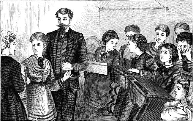 "Well, I won't laugh another bit, if I can help it; come on!" and, jumping up, Marion ran downstairs, the others following her, into the school-room; when, what was their astonishment to see before them "the swell," who had been the cause of all their trouble, standing talking to Miss Stiefbach. They went quietly to their seats, wondering what would happen next. Marion whispered to Flo, "The new French teacher; a man, as I live, and not very old either. Won't we have fun?"