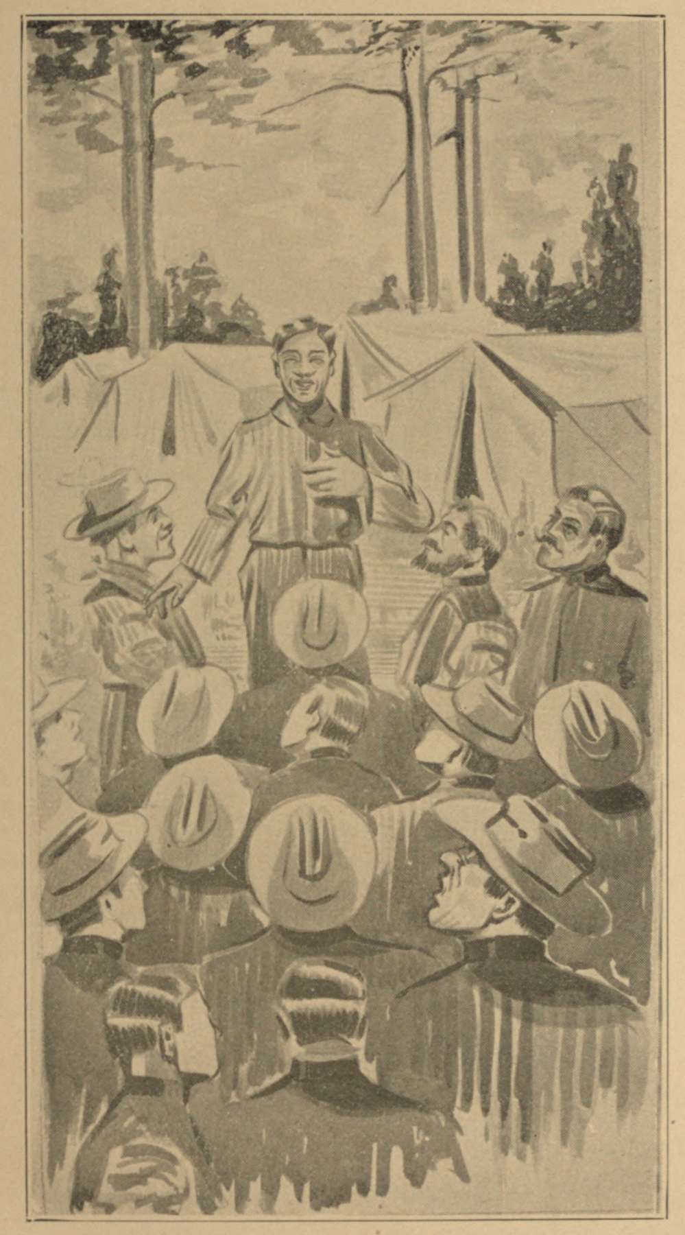 The Central road was being rebuilt from Savannah and we met the trains at its terminals, thus shortening the distance of our journeys. The train had reached Guyton, thirty miles this side of Savannah and was advancing daily until completed to Macon. It was early in the spring when I met the train at station No. 6, a flat country. It had rained nearly daily for a week; the roads were slushy, I had on a heavy load; we had traveled the whole day long until dark. It was hard to find a dry knob to camp on, until finally we came to a little elevation. I said Perry we are going to stop here. He guided the team into the woods a few paces and unhitched, while I was looking for a few lightwood knots to build up a fire. Everything was wet and it was hard to kindle up a blaze. When suddenly there arrived on the scene an ambulance pulled by a team of four splendid mules and thirteen Federal soldiers alighted. They took the grounds on the opposite side of the road. I thought to myself, Now I am into it. Perry was on his knees, fanning up the damp pine straw, when one of those fellows called, Heigho, you black fellow, come here. I said to Perry in an undertone,[245] Attend to your business. When the same fellow called again, Hello you negro, I told you to come here, did you hear me? accompanying his remarks with the coarsest words. Perry answered, My boss told me to tend to my business. D——n you and your boss, too, was his reply. As he had completed the sentence, I being close by the side of my wagon, reached up and took my Spencer in hand, bringing it from a trail to a support. I stepped to the center of the road, saying, D——n you some too. This is not the first time I have met some of you at odds, and I am ready for the fray, if it has to be. Everything was quiet, not a word was uttered. I still remained standing in the road, watching any move they might make, when one of them spoke, saying, Will you let me come to you? He spoke in a very conciliatory tone. I said, Yes, one at a time. He came to me unarmed, and said, Let us have no trouble; don't pay any attention to that fellow, he is drinking. There is plenty of room here for all of us, without any friction. I said, Well, if your friend is drunk, take care of him. I am able to take care of myself. He returned to his camp and I to mine. I heard him say to his comrades, That fellow won't do to fool with. By that time Perry had succeeded in having a rousing fire and we went to work on[246] the culinary department. Our meals were simple, a little fried meat and corn bread and water from out of a ditch. Presently one of the Federals hollered over, "Say, Johnnie, don't you want some coffee?" I answered, "No, it has been so long since I tasted any I have forgotten how it tastes." He said, We have a plenty and you are welcome to it if you will have it. I said I have no way to make coffee if I had any. So one of them came over with some parched coffee and offered it to me. I declined it, for I had no mill to grind it, nor any vessel to stew it in. They insisted, bringing over all of the paraphernalia for the brewing of coffee and I must admit that it was enjoyed by Perry, as well as myself, it being the first that had passed my lips in four years. After our meal was completed they came over, one after another and sat around the fire. The conversation became general and I found them to be very congenial company. One brought me a whole haversack full of green coffee, saying, Have it, we have a sack of over a hundred pounds. I thanked them saying, This is quite a treat. And what seemed to be a disagreeable affair in its incipiency terminated most agreeably. It having become late I suggested that we take a night cap and retire. I passed around the jug and each returned to his respective[247] quarters. However I slept, as the saying is, with one eye open. Early in the morning we fed the mules, rekindled the fire, drank a warm cup of coffee and ate a bite or so. We harnessed two of our mules, two of which in the lead were of small size, when one of the Federals proposed to swap mules. I said, Your mules are worth a great deal more than mine, and I have no money to pay boot. We don't want any money said another, we want you to have the best team on the road, by swapping your two lead mules for those tall black ones of ours you will have a real fine team. They then said they were on their way to Augusta to report to the quartermaster there, that they had receipted for four mules and a sack of coffee to be delivered to the quartermaster in Augusta. The mules in their possession were not branded as government mules but were picked up and a mule is a mule, so we deliver the number of heads is all that is required. To tell the truth I feared a trap, but while I was talking with one of them the others changed the lead mules for two of theirs and off they drove in a lope, singing, Old John Brown Lies Buried in the Ground, etc. We trudged along, Perry and I elated over our good luck, when Perry said, Well Marse Ike, your standing up to them made them your friends.