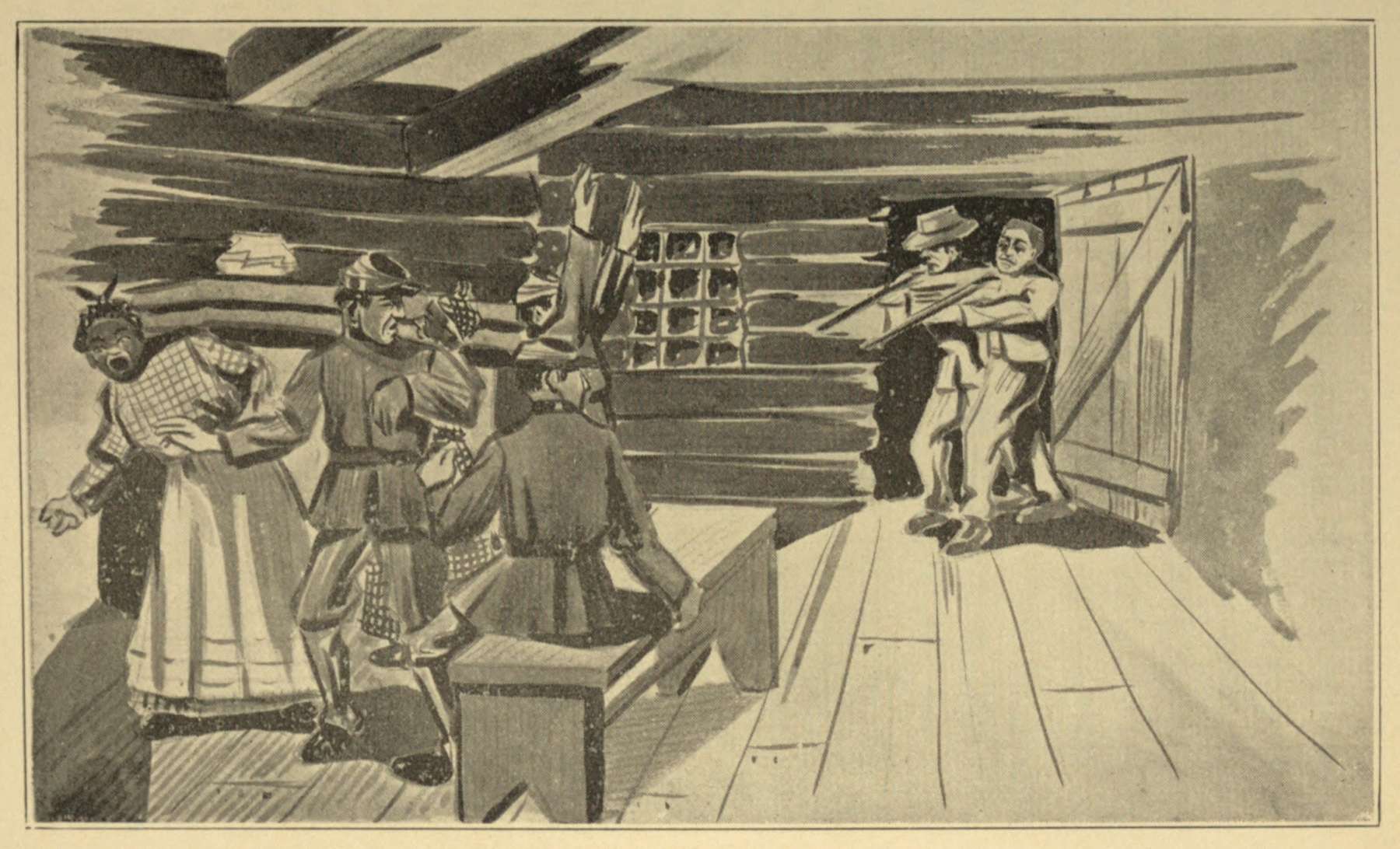 Parson proved himself a noble, patriotic host. After a couple of hours, he sent us a large pone of corn-bread, baked in an old-fashioned oven. I received about an inch square as my share,—the sweetest morsel that ever passed my lips. It was sufficient to allay the gnawing of my empty stomach,—it had a strange effect on me, for every time I would stand up, my knees would give way and down I went otherwise I felt no inconvenience.