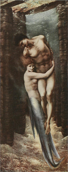 Apart from its technical beauty and its charm of design, this picture has a special interest as the only contribution which the artist ever made to the exhibitions of the Royal Academy. It was shown at Burlington House in 1886, and was painted purposely, during the months that intervened between his election as an Associate in the summer of 1885 and the opening of the 1886 exhibition. In the treatment of the subject there is a touch of slightly grim humour, unusual in the art of Burne-Jones, a humour which finds expression particularly in the face of the mermaid, who drags a human being to her cave at the bottom of the sea without thinking or caring that her sport means death to him.