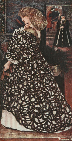 This point needs to be elaborated for the sake of clearing up any misapprehensions which might arise from his more or less erratic way of exhibiting his work. As an example, when he exhibited for the first time in 1864 in the gallery of the Royal Society of Painters in Water Colours, he showed the "Fair Rosamond," painted in 1862, with the "Annunciation" and "The Merciful Knight," both of which belong to 1863; but in 1865 he sent "A Knight and a[Pg 52] Lady," finished just before the exhibition opened, "Green Summer," painted in 1863, and "The Enchantments of Nimue," which was one of the things he produced in 1861 while he was still frankly and unreservedly an imitator of Rossetti. Such an inversion in the order in which his works were set before the public might cause some perplexity to students of his art if they did not realise what was his custom in this matter.