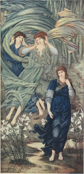 The first idea for the "Sponsa di Libano" was embodied in one of a series of pencil designs from the "Song of Solomon," which were prepared by Burne-Jones in 1876. This picture, the only one out of the series which he actually completed pictorially, was exhibited at the New Gallery in 1891. The motive of the composition is explained in the text which the original drawing illustrated: "Awake, O North Wind; and come, thou South; blow upon my garden that the spices thereof may flow out." In the treatment of the subject the artist's poetic fancy and sense of decorative arrangement are particularly well displayed.