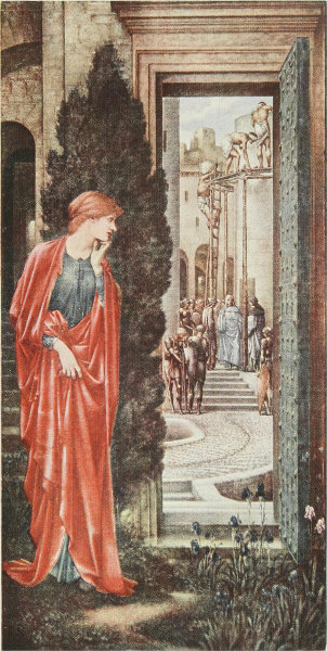 Like the "Sibylla Delphica" this canvas shows how Burne-Jones was accustomed to treat subjects from the classic myths in the mediæval spirit to which he inclined by habit and association. In his illustration of a subject from the story of Danae, where she stands watching in wonder the building of the tower of brass which was to be her prison, he has looked at Greek tradition in a way that was partly his own and partly a reflection of William Morris; but the result is none the less persuasive because it does not conform to the Greek convention.
