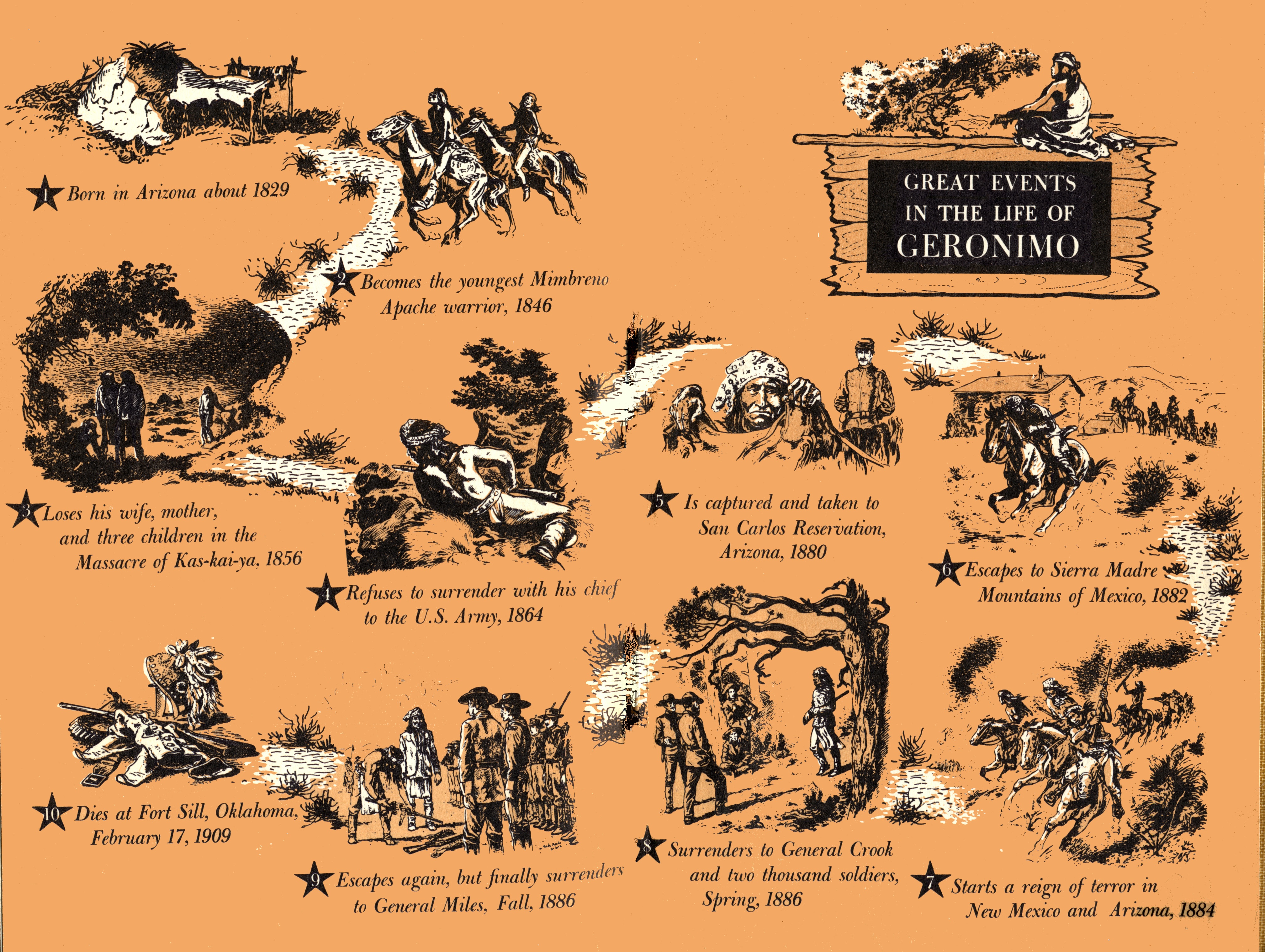 So ended the fighting days of Geronimo, the last and fiercest Apache war chief. And so, also, ended the Indian Wars in the Southwest. Never again would men and women on lonely ranches or in isolated villages awaken, trembling, in the middle of the night to hear the pound of ponies' hoofs and the wild Apache war cry. Never again would travelers in Arizona, New Mexico, and northern Mexico find it necessary to travel in groups and well-armed for fear of Apache attacks.