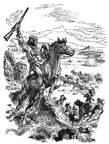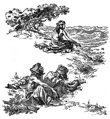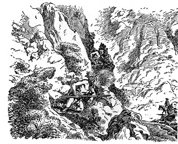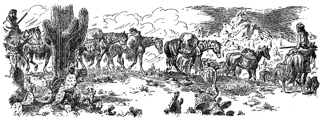 This was desert country, and they stopped in a cluster of rocky hills. Delgadito and Chie dismounted and climbed the tallest hill to scout from its summit. Soon they returned and told the others to dismount too. Tether ropes were slipped about the necks of the loose horses, which were now led by the raiders as all went on quietly.